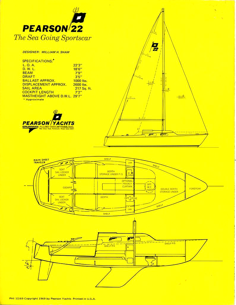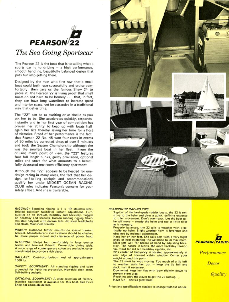 Designed by the man who first saw that a small boat could both race successfully and cruise comfortably, then gave us the famous Shaw 24 to prove it, the Pearson 22 is living proof that small boats do not have to be homely... that, in fact, they can have long waterlines to increase speed and interior space, yet be attractive in a traditional way that defies time.