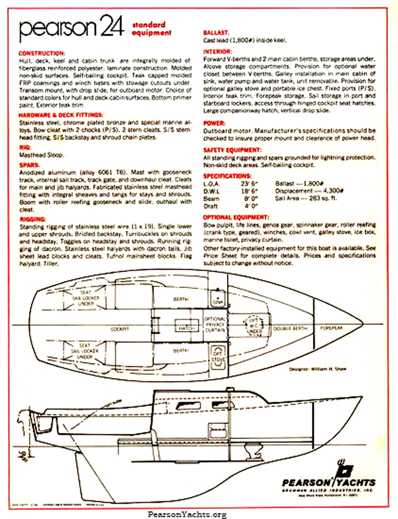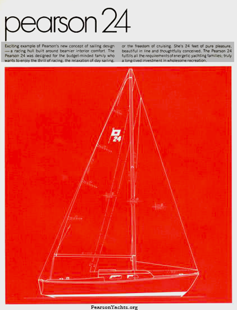 Exiting example of Pearson's new concept in sailing design — a racing hull built around beamier interior comfort. The Pearson 24 was designed for the budget-minded family who wants to enjoy the thrill of racing, the relaxation of day sailing or the freedom of cruising. She's 24 feet of pure pleasure, beautiful in line and thoughtfully conceived. The Pearson 24 fulfills all the requirements of energetic yachting families; truly a long-lived investment in wholesome recreation.
