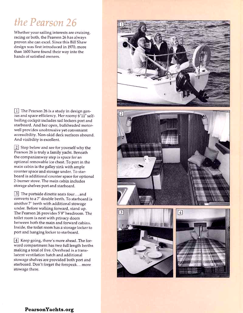 The Pearson 26 indeed set the pace for others to follow. When other boats under 30 feet with equivalent accomodations looked like layer cakes and cost way out of proportion to their size, the 26 showed the way in comfort, appearance, and price. Under the guiding hand of Bill Shaw, the acknowledged master of space, efficiency, and good looks in yacht design, the 26 has proven that speed, ability, and accomodations can, in fact, go hand in hand.
