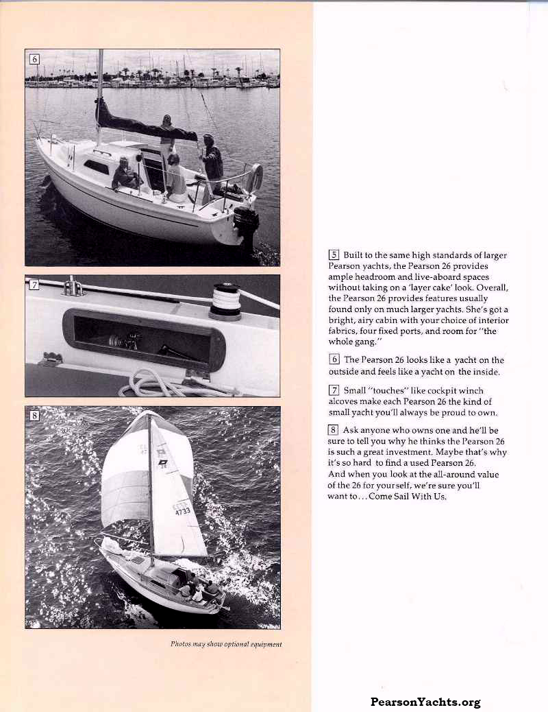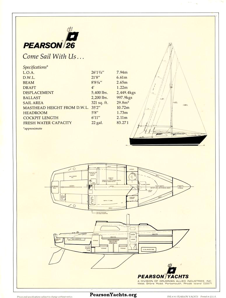 Qualities that were never before seen in boats her size are standard in this remarkable boat - 5' 9" headroom, a fully enclosed toilet room, five full-length berths, a convertable dinette, anodized spars, forward hatch, and a luxurious interior color plan at a price that defies comparison. And with all this, the Pearson 26 succeeds in looking like a yacht outside and feeling light a yacht inside.