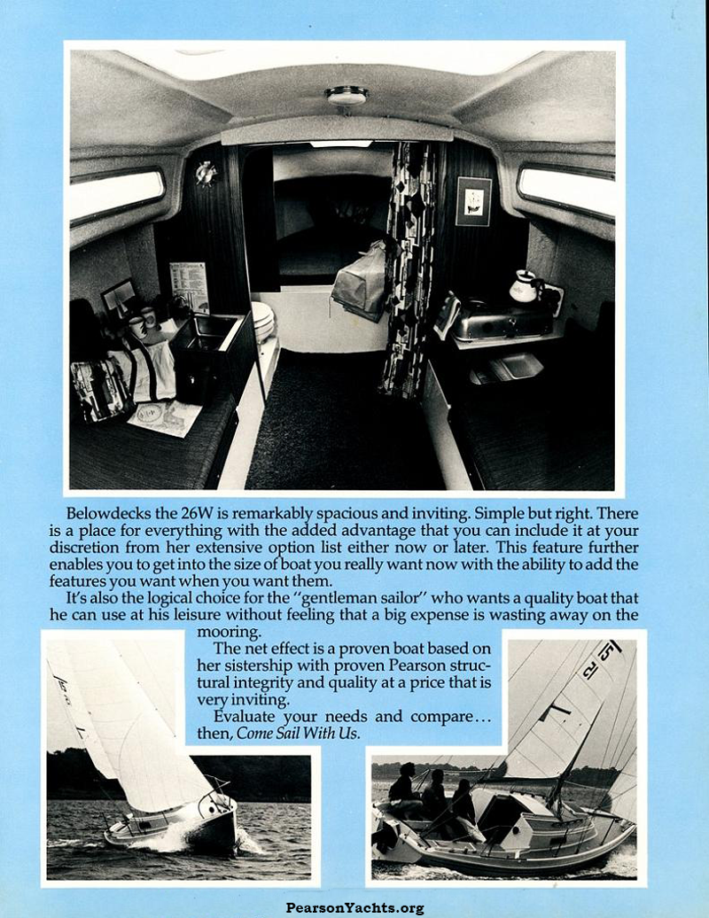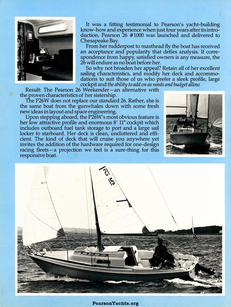 The Pearson 26 Weekender - an alternative with the proven characteristics of her sistership, the Pearson 26. The idea was to retain all of her excellent sailing characteristics, and modify her deck and accommodations to suit those of us who perfer a sleek profile, large cockpit and the ability to add on as needs and budget allows. The P26W does not replace our standard 26. Rather, she is the same boat from the gunwhales down with some fresh new ideas in layout and space engineering.