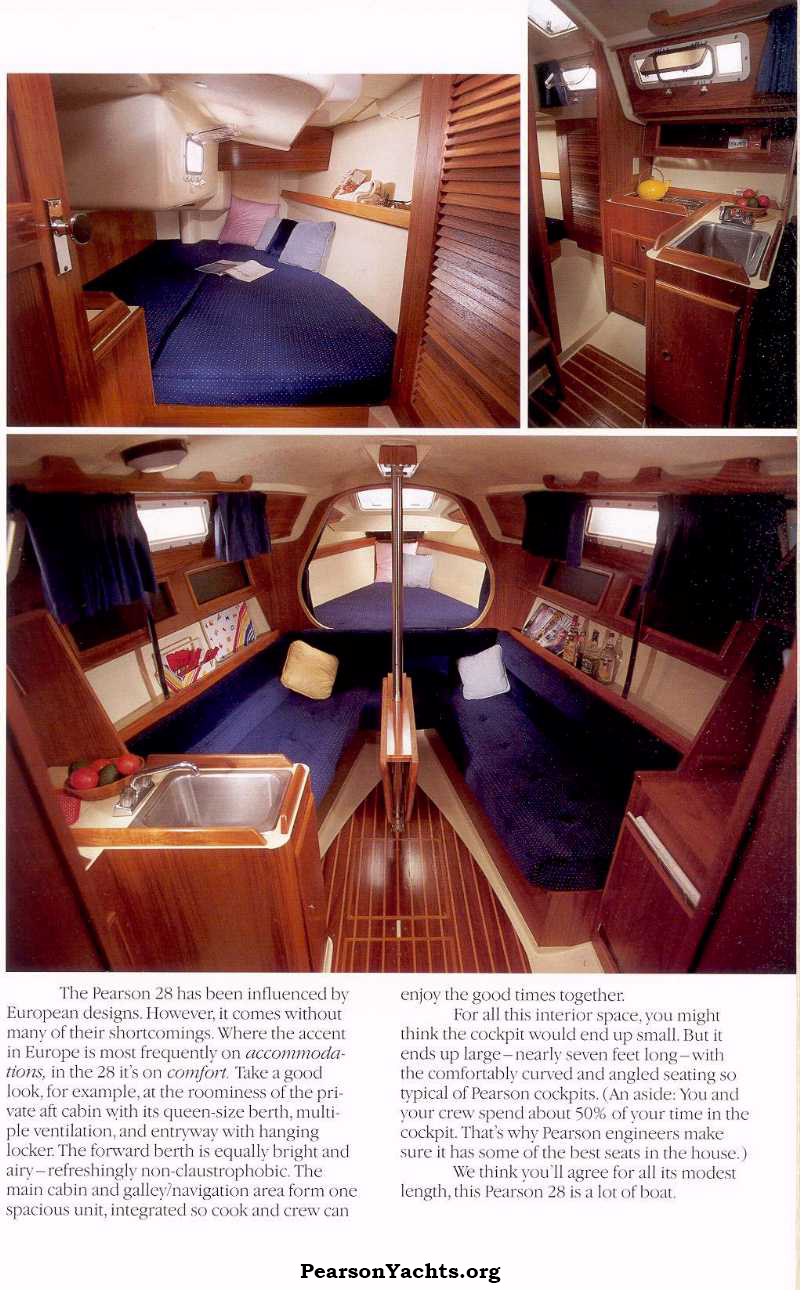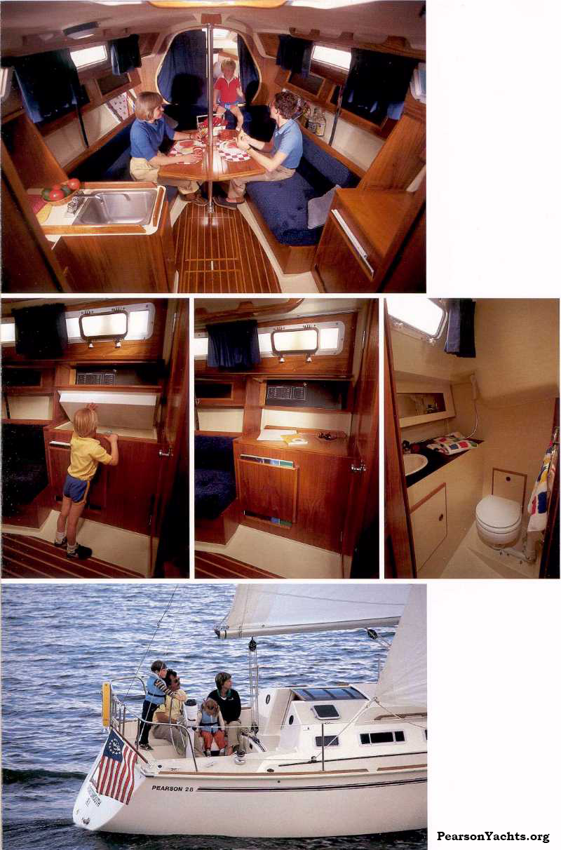 The new Pearson 28 is our third generation of boats this size, and represents the very latest thinking in design, engineering, and owner preferences. A quick glance at her 24'4 1/2" waterline length and 9'10" beam dimensions indicate just how spacious she is. Truly, an extremely accommodating 28 footer. The challenge was to use this space to maximum advantage and this is where our design group has carved out new territory. For example, there are two real double berths - one forward and another enclosed stateroom aft to port - they provide desirable privacy while the enclosed head is located further aft than we have seen recently using a wider part of the boat to its best advantage.
