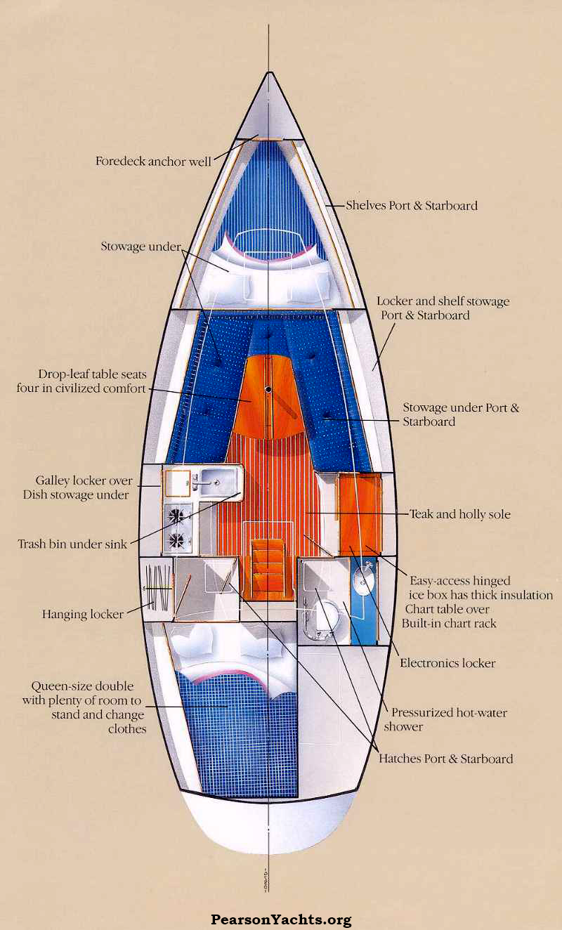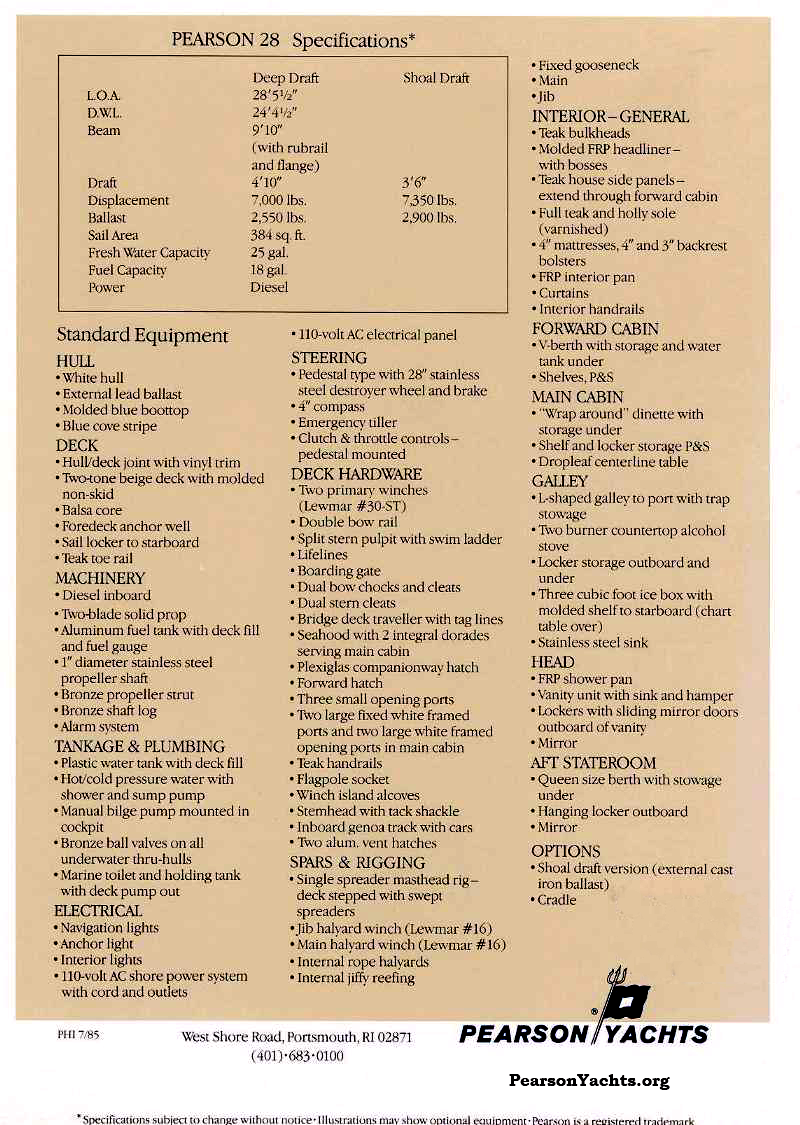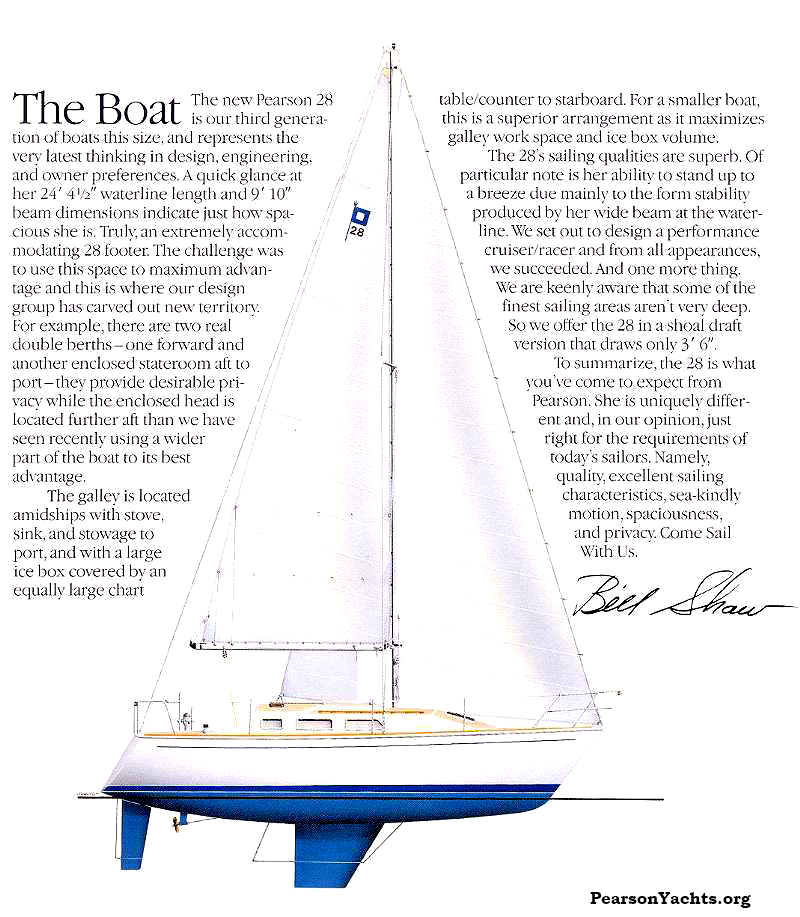 To summarize, the 28 is what you've come to expect from Pearson. She is uniquely different and, in our opinion, just right for the requirements of today's sailors. Namely, quality, excellent sailing characteristics, sea-kindly motion, spaciousness, and privacy. Come Sail With Us.