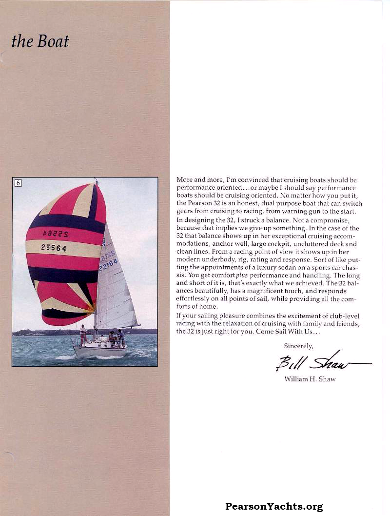 In designing the 32, I struck balance. Not a compromise, because that implies we give up something. In the case of the 32 that balance shows up in her exceptional cruising accommodations, anchor well, large cockpit, uncluttered deck and clean lines. From a racing point of view it shows up in her modern underbody, rig, rating and response. Sort of like putting the appointments of a luxury sedan on a sports car chassis. You get comfort plus performance and handling. The long and short of it is, that’s exactly what we achieved. The 32 balances beautifully, has a magnificent touch, and responds effortlessly on all points of sail, while providing all the comforts of home.