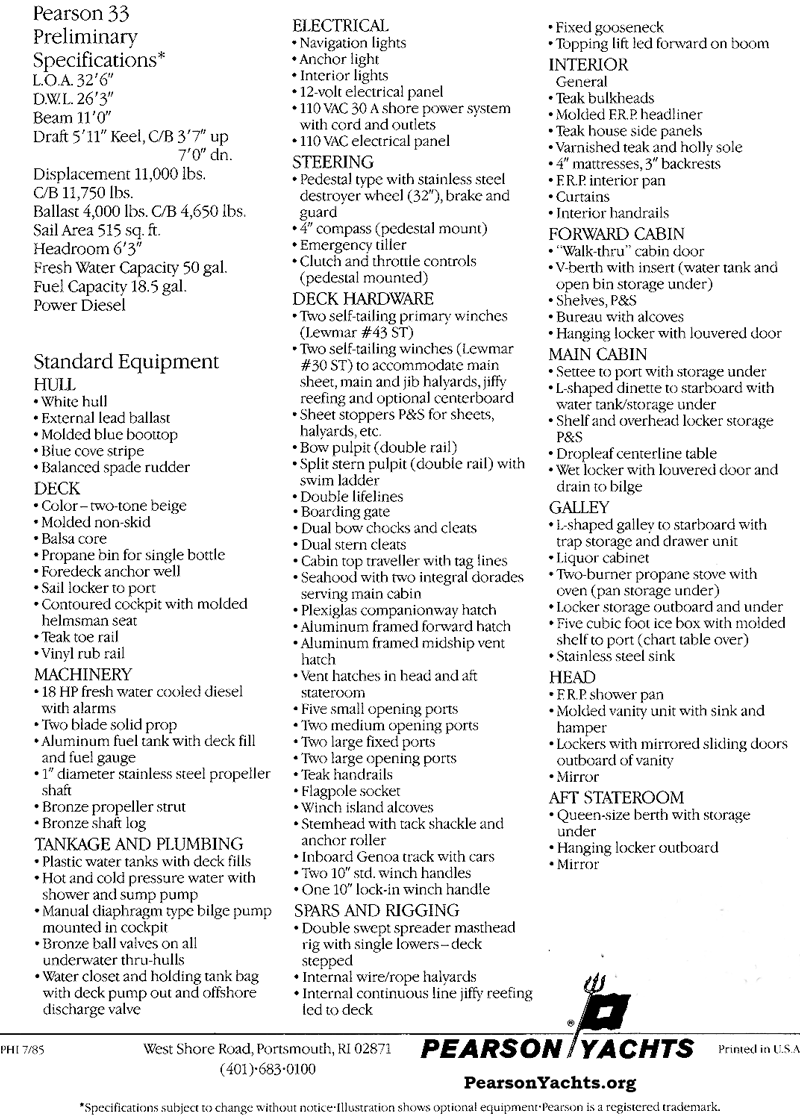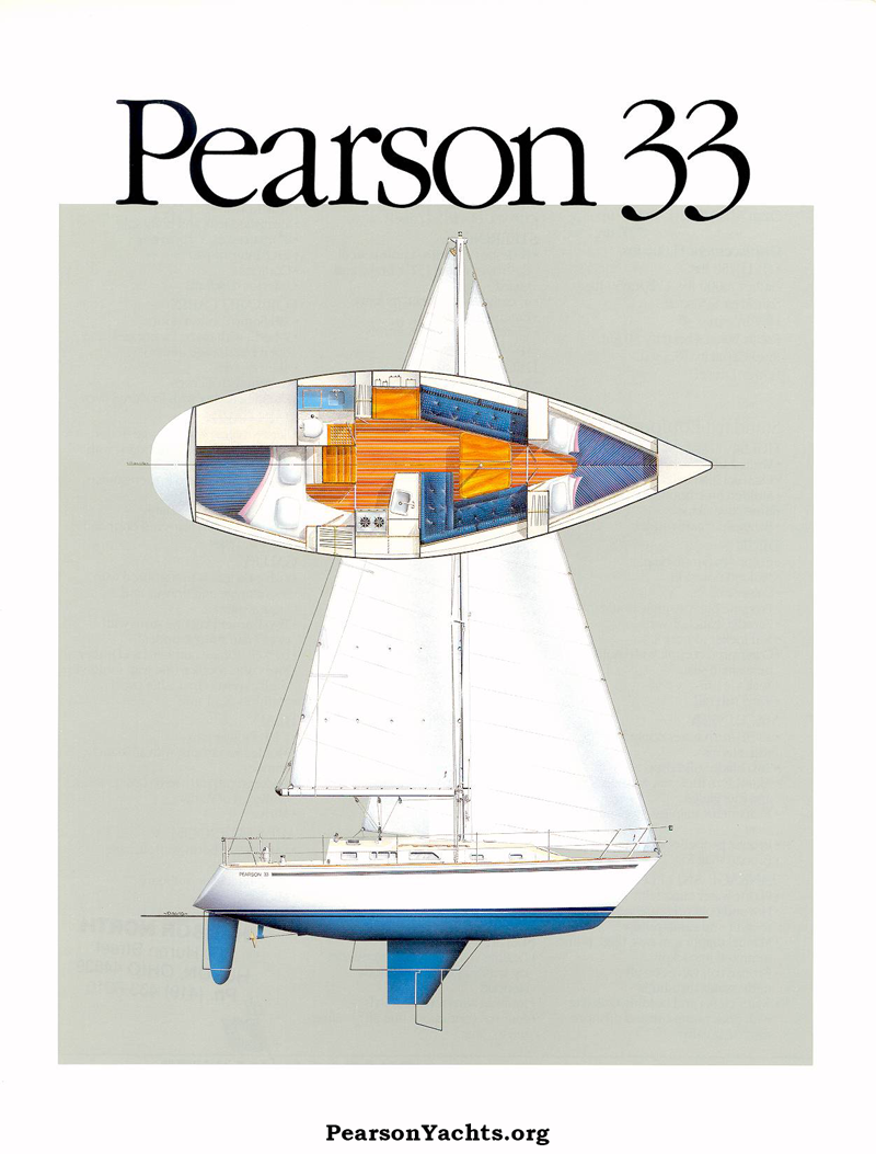 The new Pearson 33 is the third design in our series of contemporary cruisers/racers and reflects a trend towards a preference for performance cruising boats. Its generous rig combined with its modern hull shape gives the Pearson 33 the ability to stand up in a breeze, yet remain responsive in light air. Today’s owners want more speed in cruising boats, and a greater ability to maneuver in tight quarters.