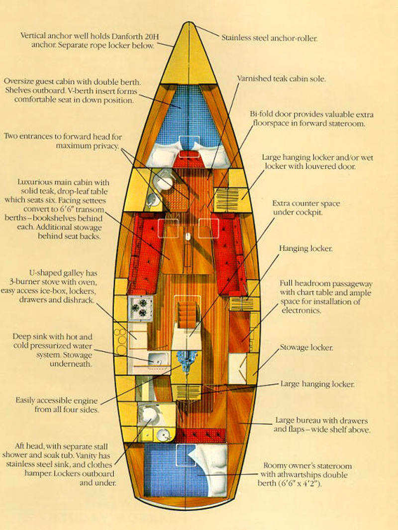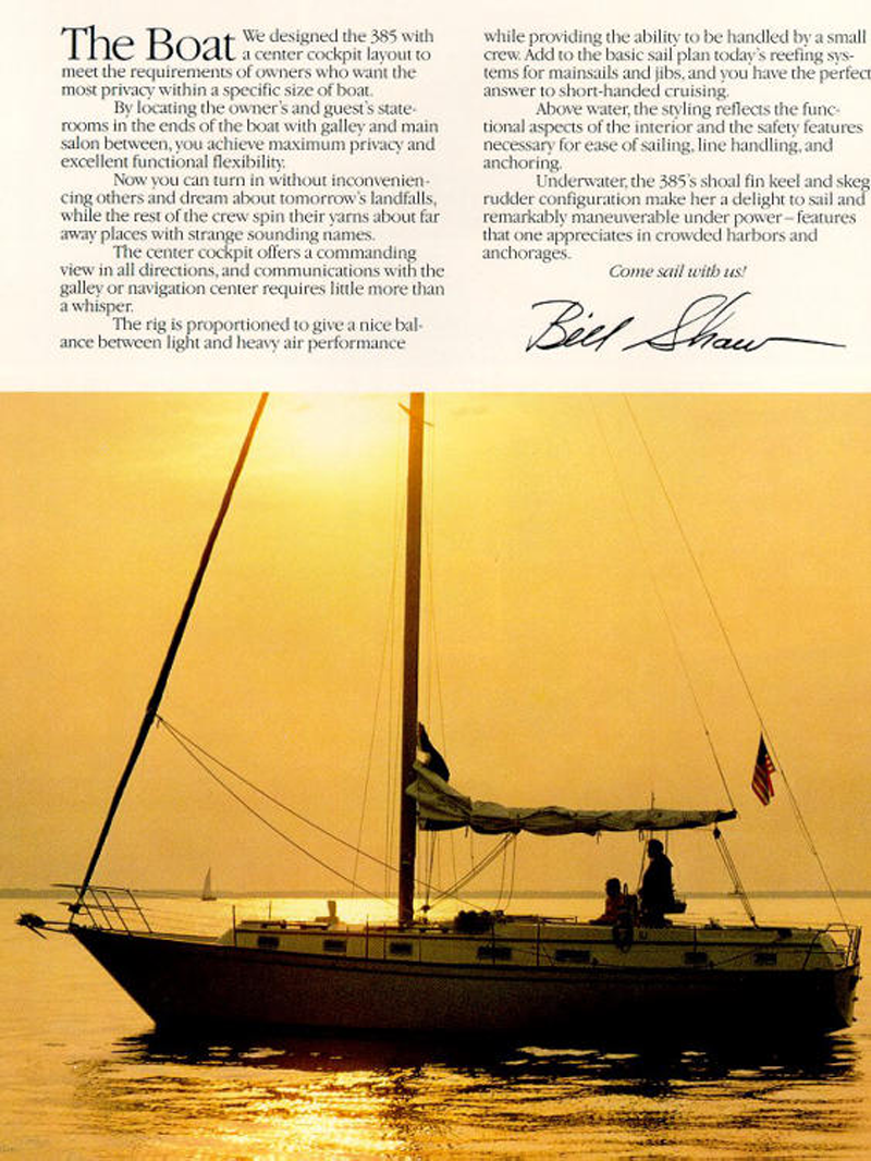 Underwater, the 385's shoal fin keel and skeg rudder configuration make her a delight to sail and remarkable maneuverable under power - features that one appreciates in crowded harbors and anchorages.