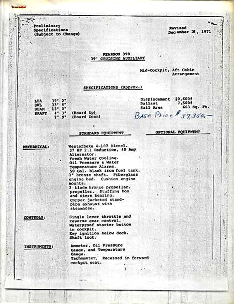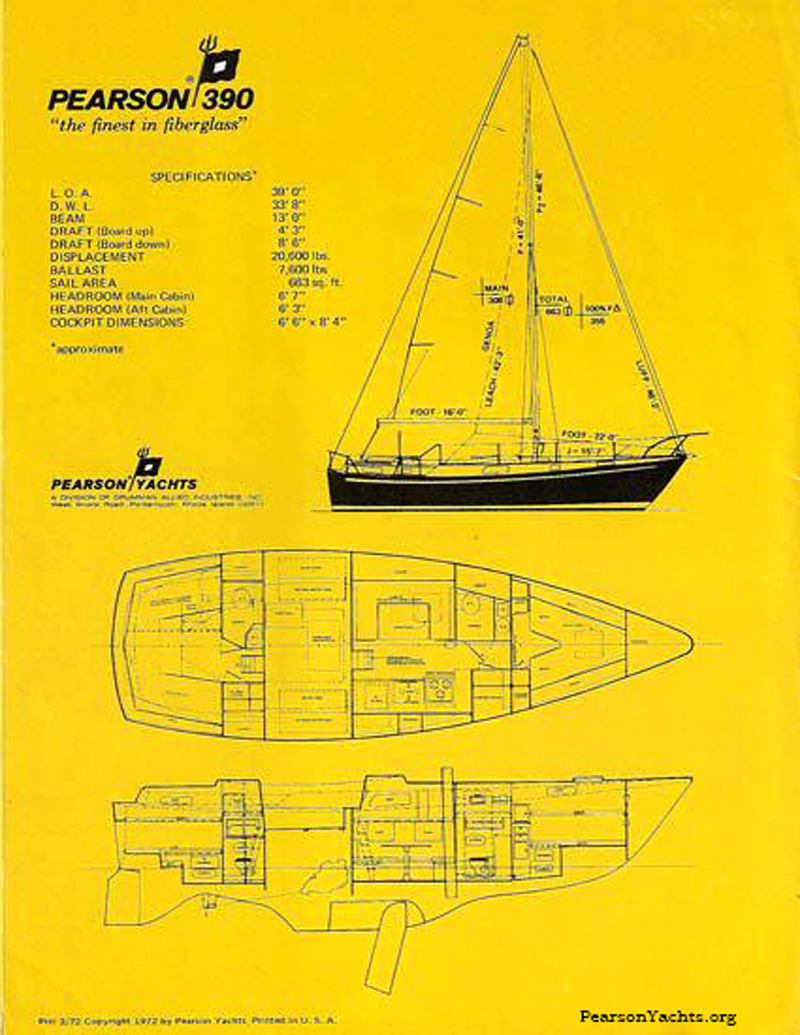 A brief history about the boat. We designed a boat for the charter service in the Bahamas called the Pearson 390, she was 39 ft. overall. I believe we built about thirty of this model which was very successful in the charter trade but lacked some features that individual owners wanted. When the 390 program was finished we re-worked the hull mold and made a new deck mold for a center cockpit which became the Pearson 419. Several years later the market wanted aft cockpit and this became the Pearson 424. This was a very successful design and I am sure in your search you must have run into a number of these. Finally the market demands retured to the center cockpit which became the Pearson 422.
