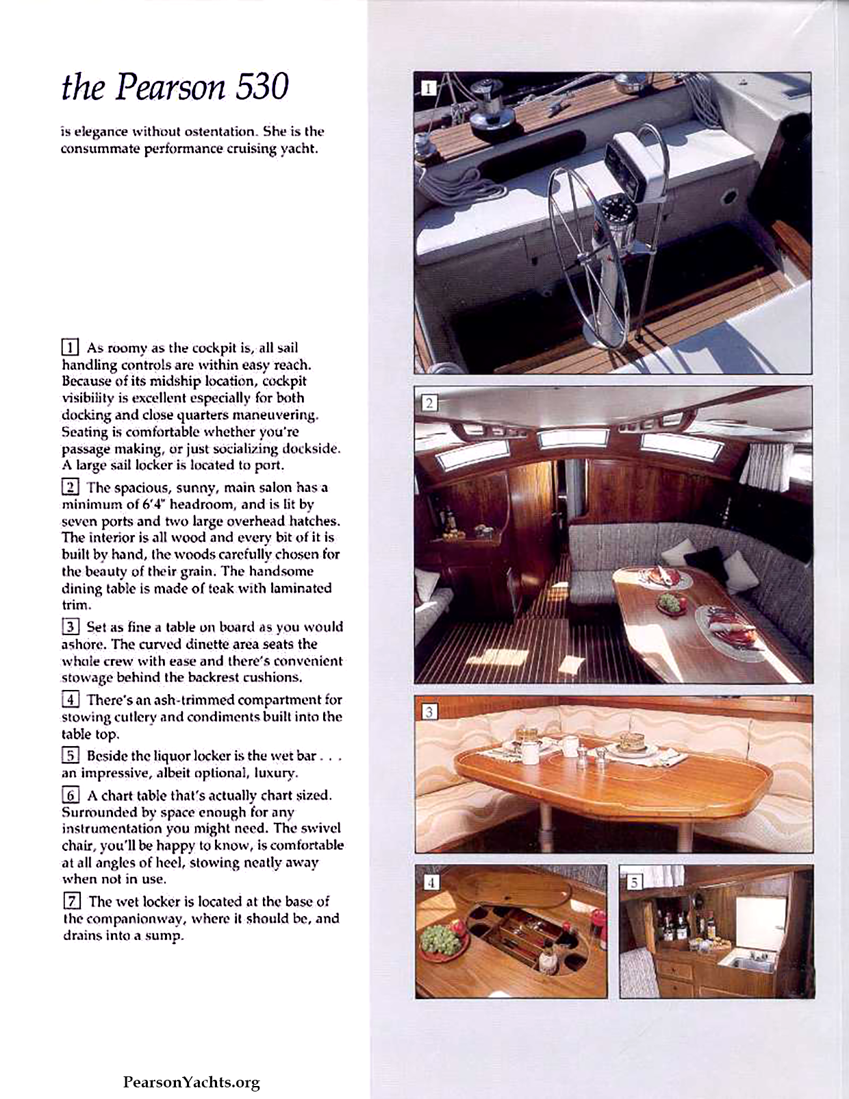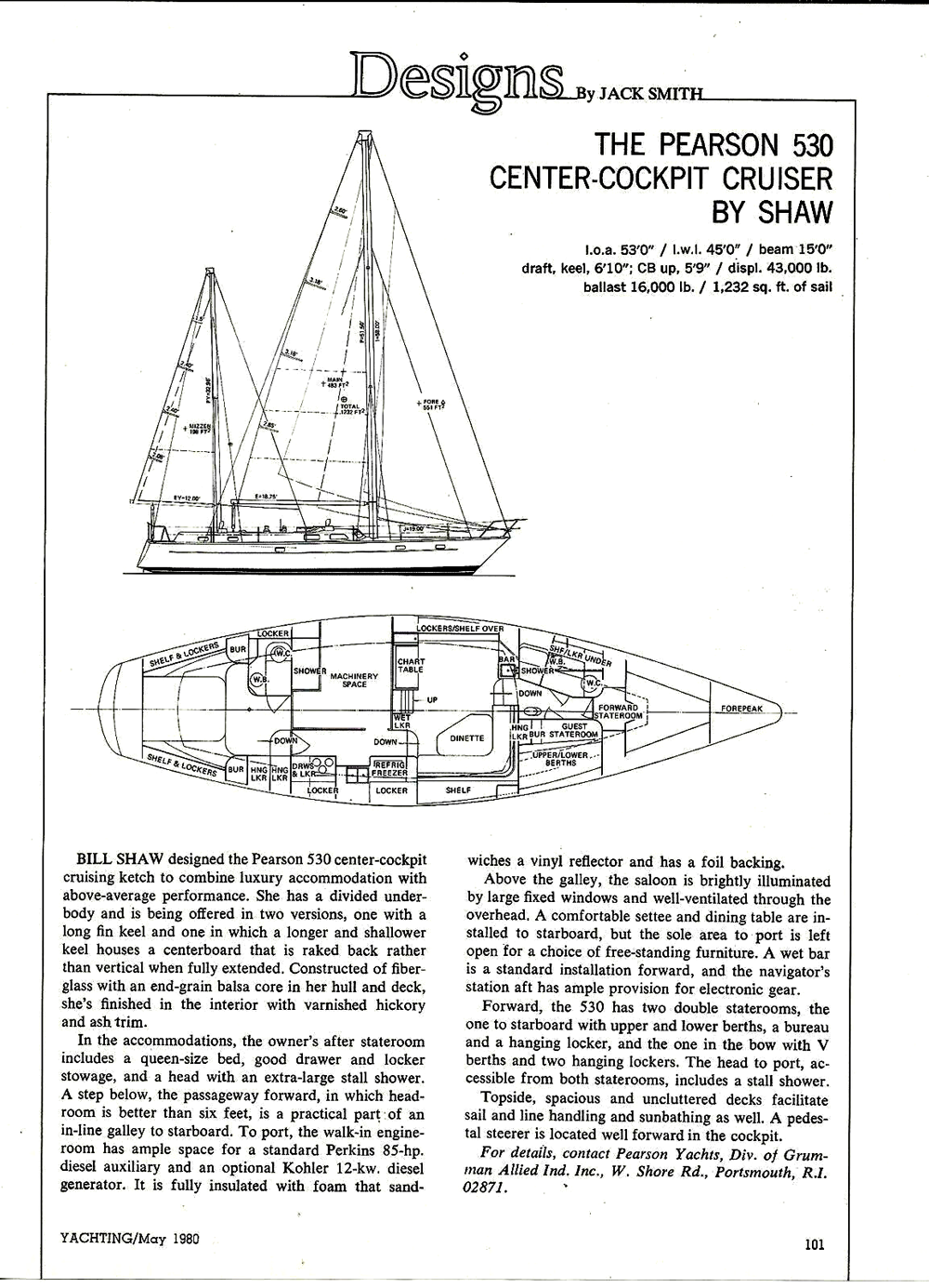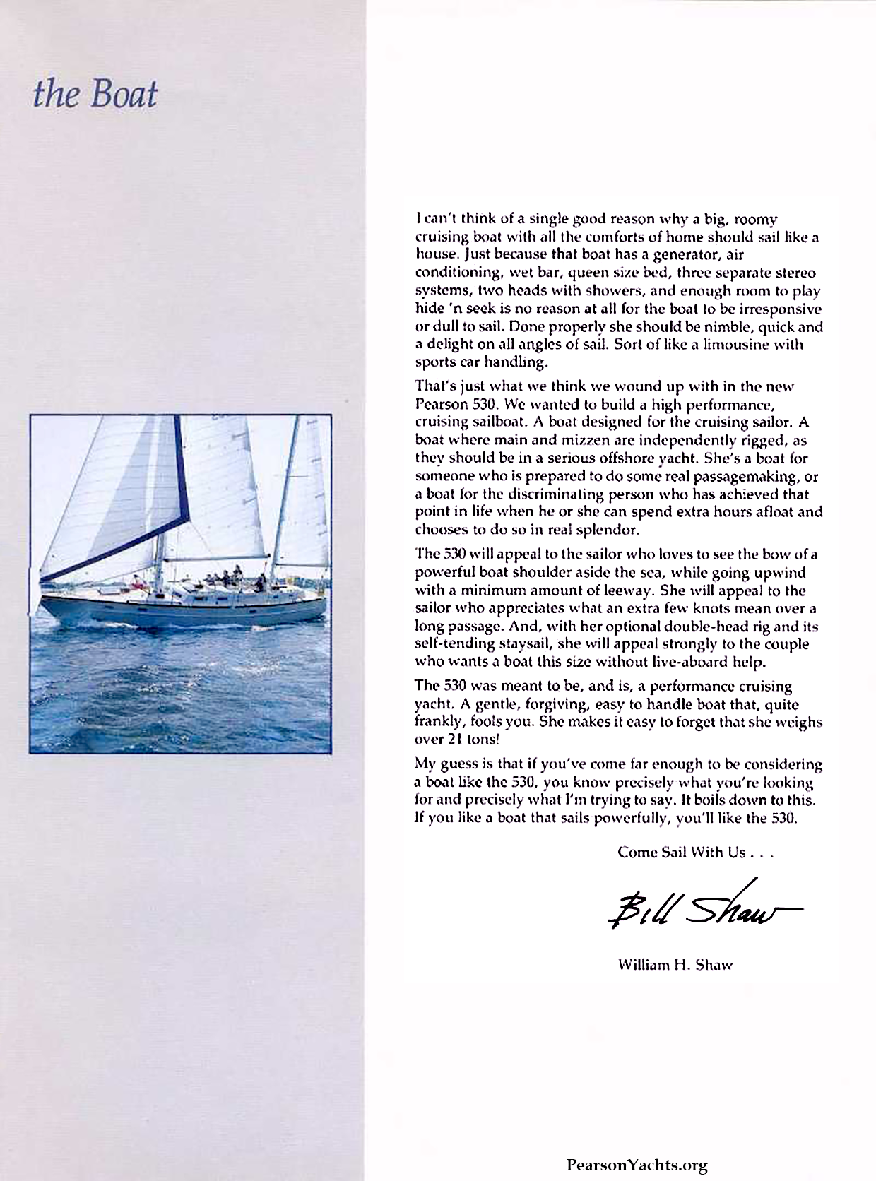 That's just what we think we wound up with in the new Pearson 530. We wanted to build a high performance, cruising sailboat. A boat designed for the cruising sailor. A boat where main and mizzen are independently rigged, as they should be in a serious offshore yacht. She's a boat for someone who is prepared to do some real passagemaking, or a boat for the discriminating person who has achieved that point in life when he or she can spend extra hours afloat and chooses to do so in real splendor.