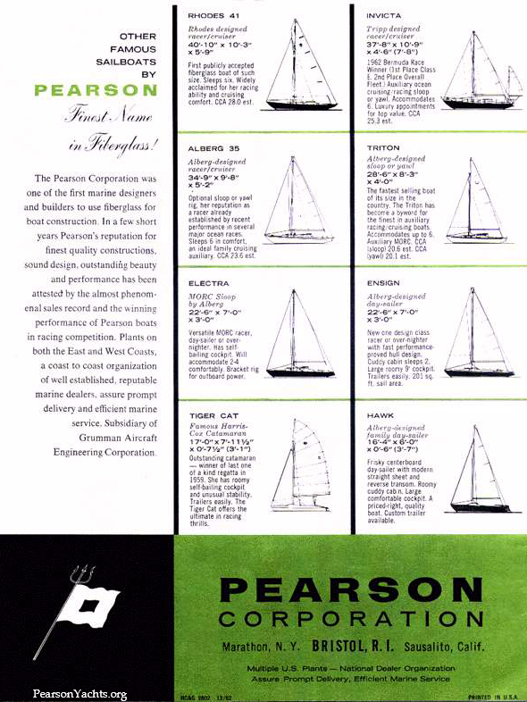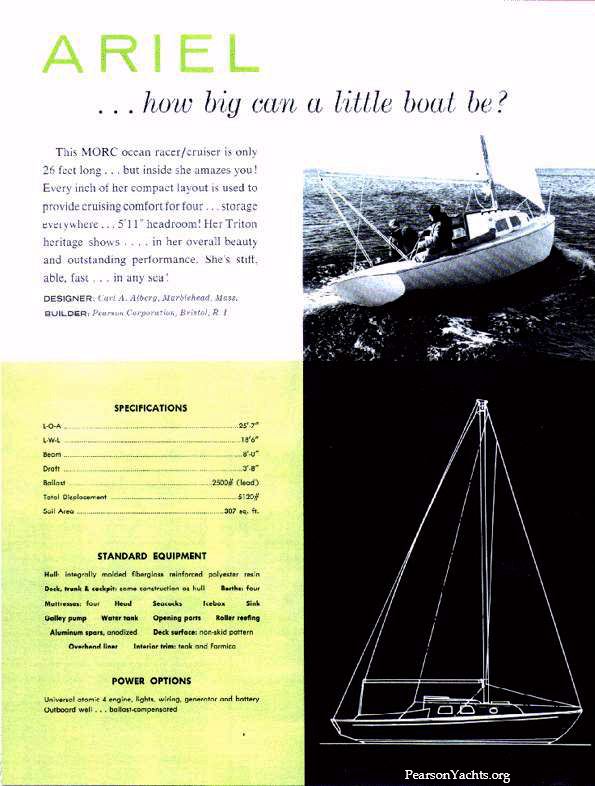 The Ariel and a later daysailing version, the Pearson Commander share a common hull and rig, but the Commander has a smaller and more spartan cabin to allow for a very spacious cockpit. Of the more than 50 boat designs Carl Alberg produced after leaving the John G. Alden firm to design on his own, Alberg chose the Commander as his personal boat (Hull #302). This boat was named "ALMA" in honor of his wife and for many of his later years was sailed out of Marblehead, Ma.
