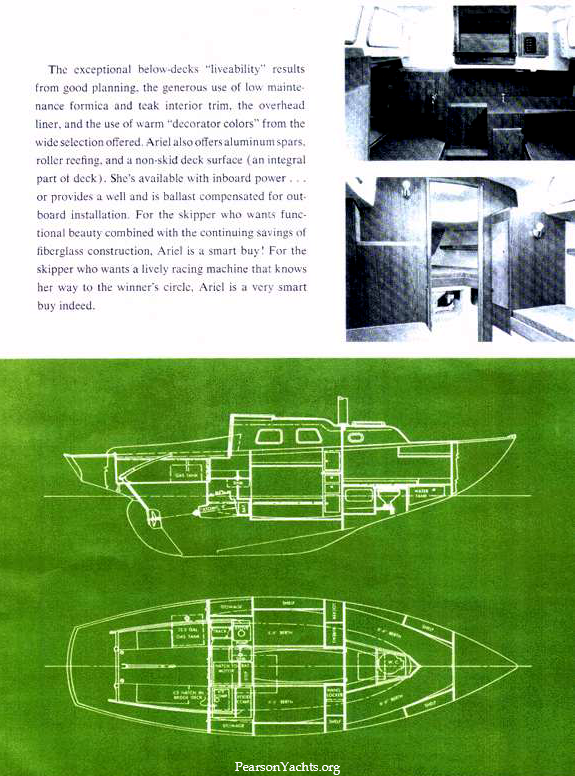 The exceptional below-decks "liveability" results from good planning, the generous use of low maintenance formica and teak interior trim, the overhead liner, and use of warm "decorator colors" from the wide selection offered. Ariel also offers aluminum spars, roller reefing, and a non-skid deck surface (an integral part of the deck). She's available with inboard power... or provides a well and is ballast compesnasted for outboard installation. For the skipper who wants functional beauty combined with the continuing savings of fiberglass construction, Ariel is a smart buy! For the skipper who wants a lively racing machine that knows her way to the winner's circle, Ariel is a very smart buy indeed.