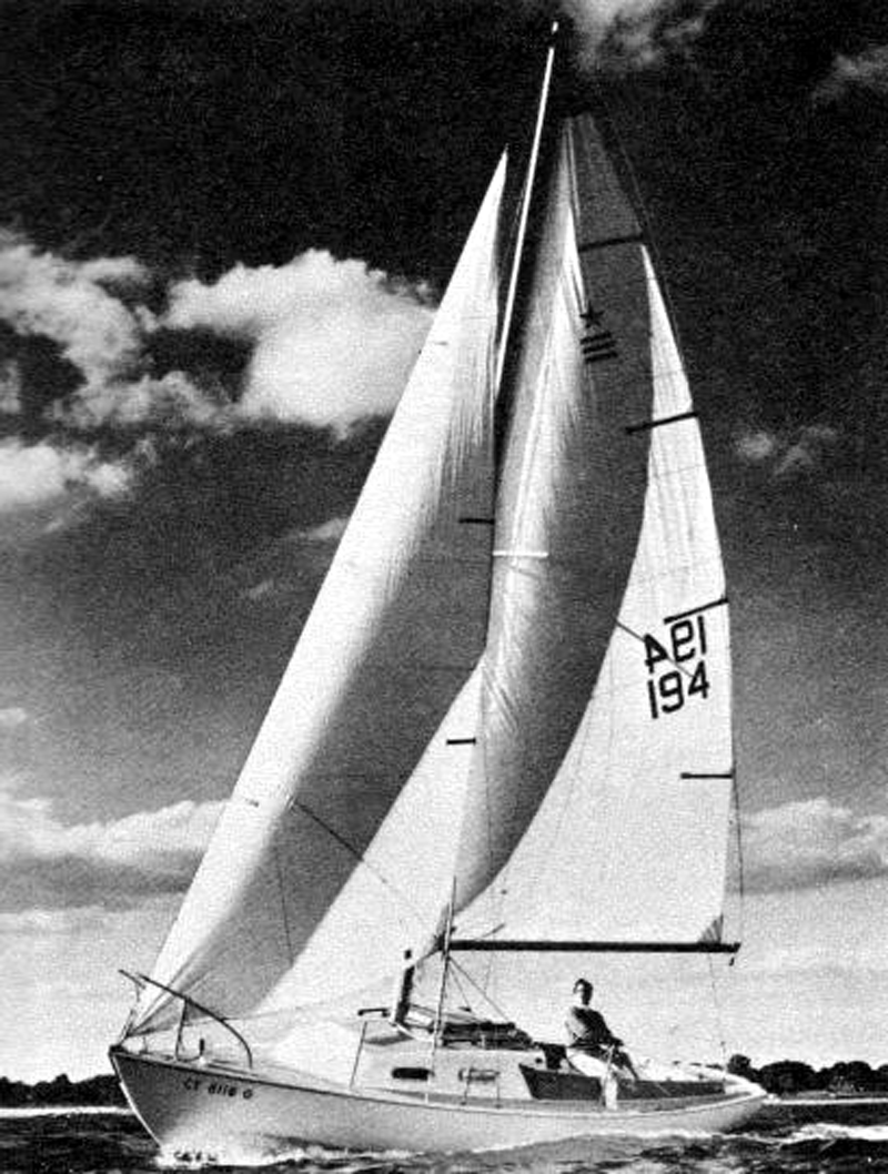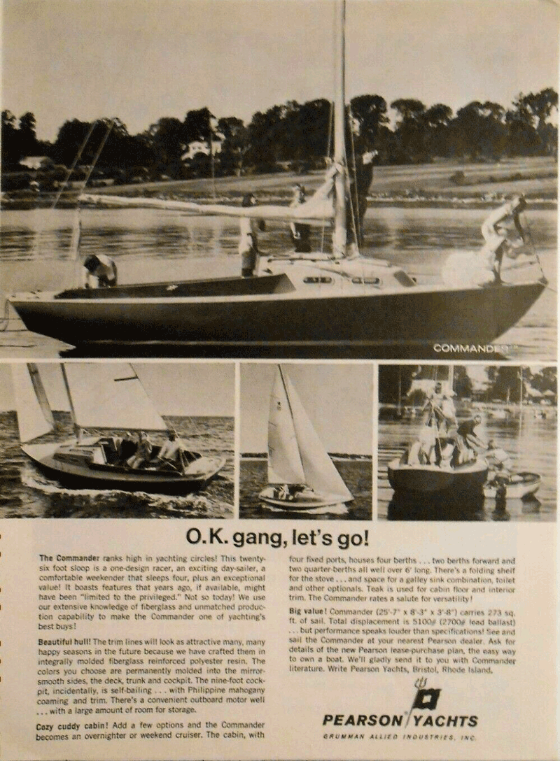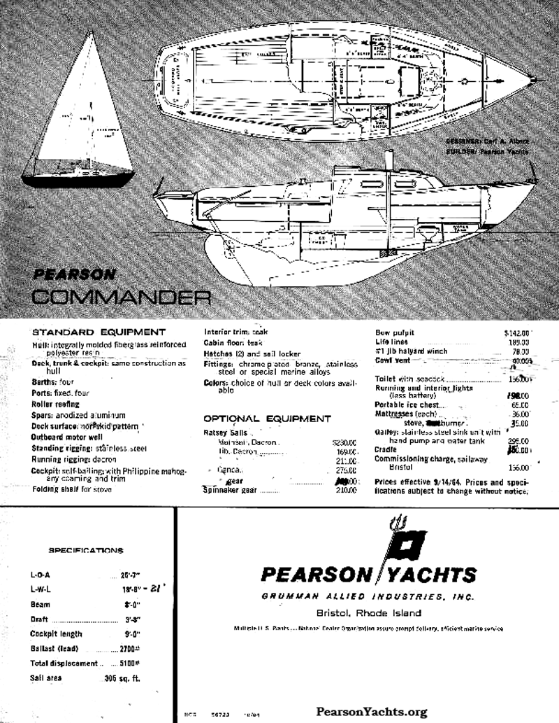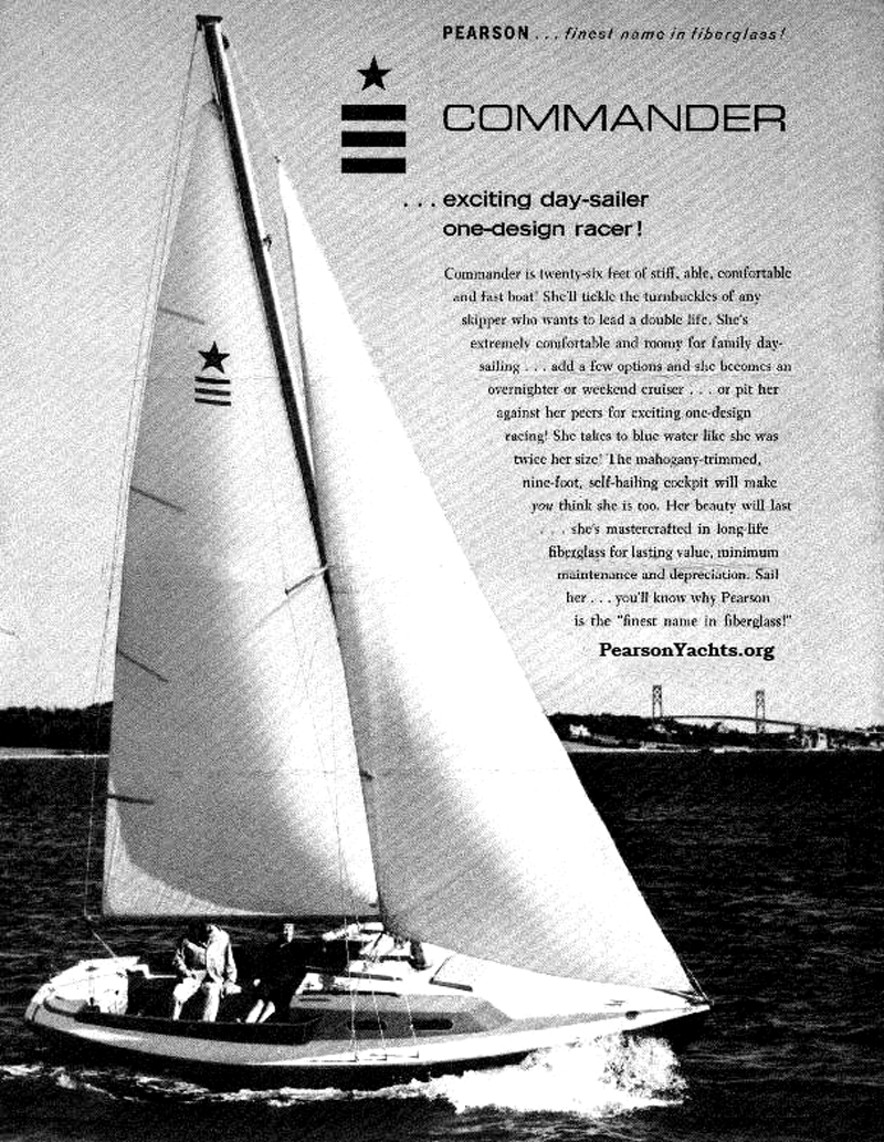 Commander is twenty-six feet of stiff, able, comfortable and fast boat. She'll tickle the turnbuckles of any skipper who wants to lead a double life. She's extremely comfortable and roomy for family day-sailing... add a few options and she becomes an overnighter or weekend cruiser... or pit her against her peers for exiting one-design racing! She takes to blue water like she was twice her size! The mahogany-trimmed, nine-foot, self-bailing cockpit will make you think she is too. Her beauty will last... she's mastercrafted in long-life fiberglass for lasting value, minimum maintenance and depreciation. Sail her... you'll know why Pearson is the "finest name in fiberglass!"