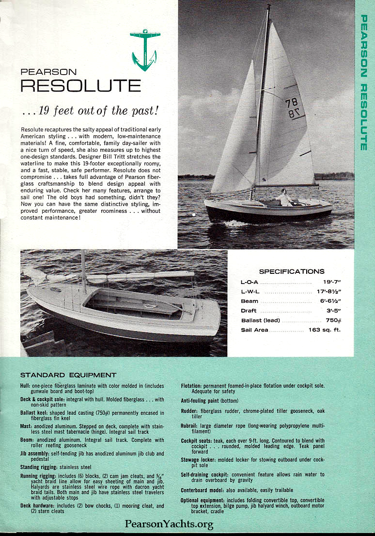 Resolute recaptures the salty appeal of traditional early American styling... with modern, low-maintenance materials! A fine, comfortable, family day-sailer with a nice turn of speed, she also measures up to highest one-design standards. Designer Bill Tritt stretches the waterline to make this 19-footer exceptionally roomy, and a fast, stable, safe performer. Resolute does not compromise... takes full advantage of Pearson fiberglass craftsmanship to blend design appeal with enduring value. Check her many features, arrange to sail one! The old boys had something, didn't they? Now you can have the same distinctive styling, improved performance, greater roominess... without constant maintenance!
