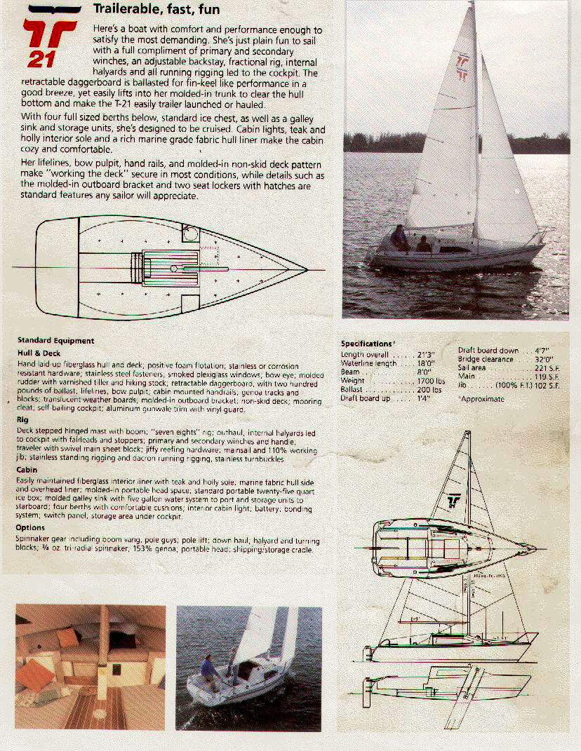 Here's a boat with comfort and performance enough to satisfy the most demanding. She's just plain fun to sail with a full compliment of primary and secondary winches, an adjustable backstay, fractional rig, internal halyards and all running rigging led to the cockpit. The retractable daggerboard is ballasted for fin-keel like performance in a good breeze, yet easily lifts into her molded-in trunk to clear the hull bottom and make the T-21 easlily trailer launches or hauled.
