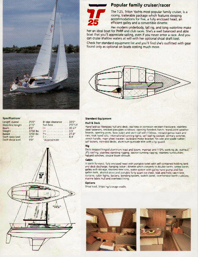 The Triton 25, Triton Yachts most popular family cruiser, is a roomy, trailerable package which features sleeping accommodations for five, a fully enclosed head, an efficient galley and a convertable dinette.