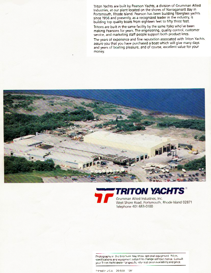 Triton Yachts were built by Pearson Yachts, a division of Grumman Allied Industries, at our plant located on the shores of Narragansett Bay in Portsmouth, Rhode Island. Pearson has been building fiberglass yachts since 1956 and presently, as a recognized leader in the industry, is buildinng top quality boats from eighteen feet to fifty three feet.