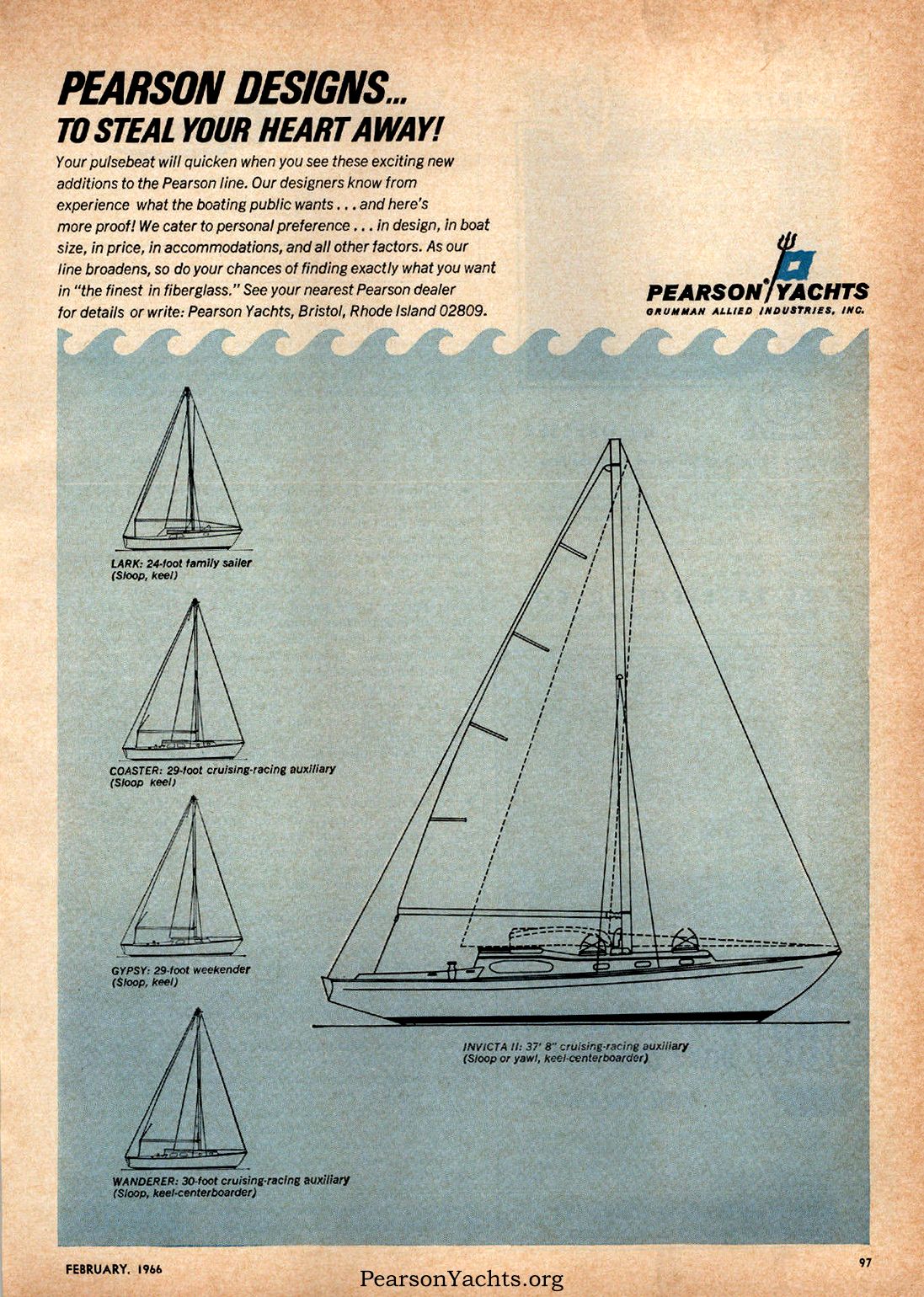 Your pulsebeat will quicken when you see these exciting new additions to the Pearson line. Our designers know from experience what the boating public wants.. and here's more prooof! We cater to personal preference... in design, in boat size, in price, in accommodations, and all other factors. As our line broadens, so do your chances of finding exactly what you want in "the finest in fiberglass/" See your nearest Pearson dealer for details.