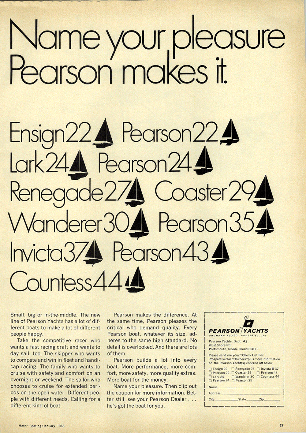 Name your pleasure. Then clip out the coupon for more information. Better still, see your Pearson Dealer... he's got the boat for you.