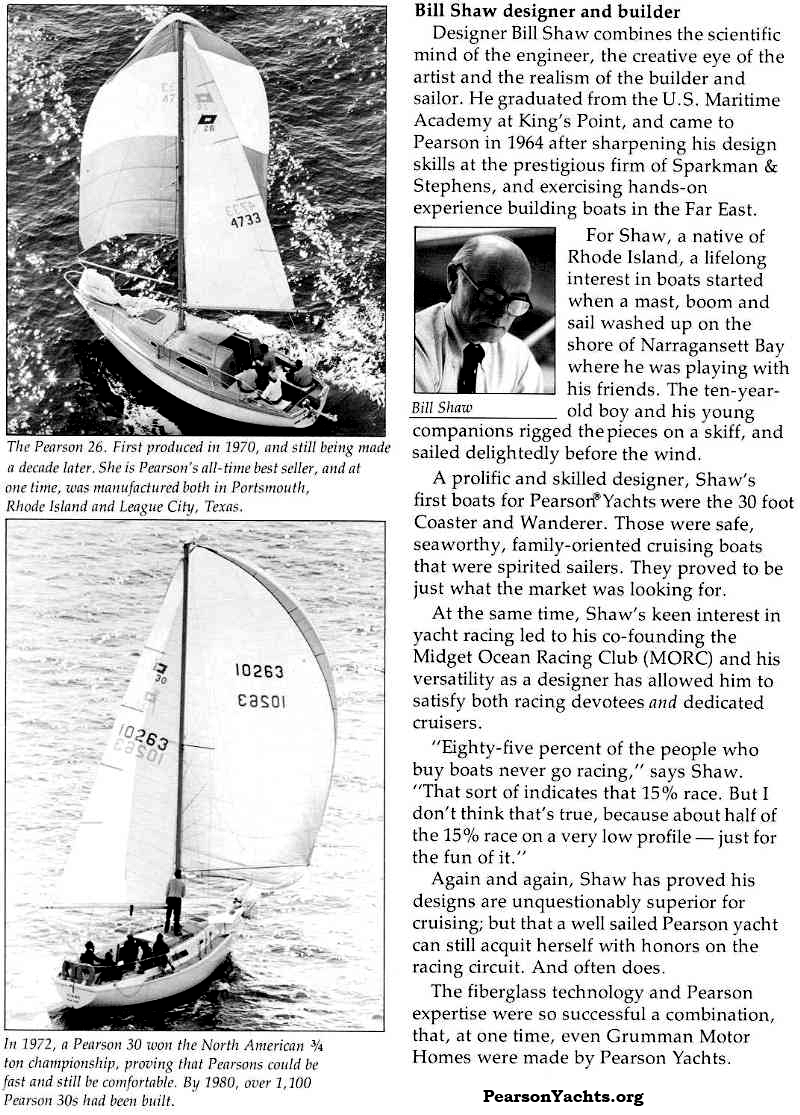 Designer Bill Shaw combines the scientific mind of the engineer, the creative eye of the artist and the realism of the builder and sailor. He graduated from the U.S. Maritime Academy at King's Point, NY, and came to Pearson in 1964 after sharpening his design skills at the prestigious firm of Sparkman & Stephens, and exercising hands-on experience building boats in the Far East.