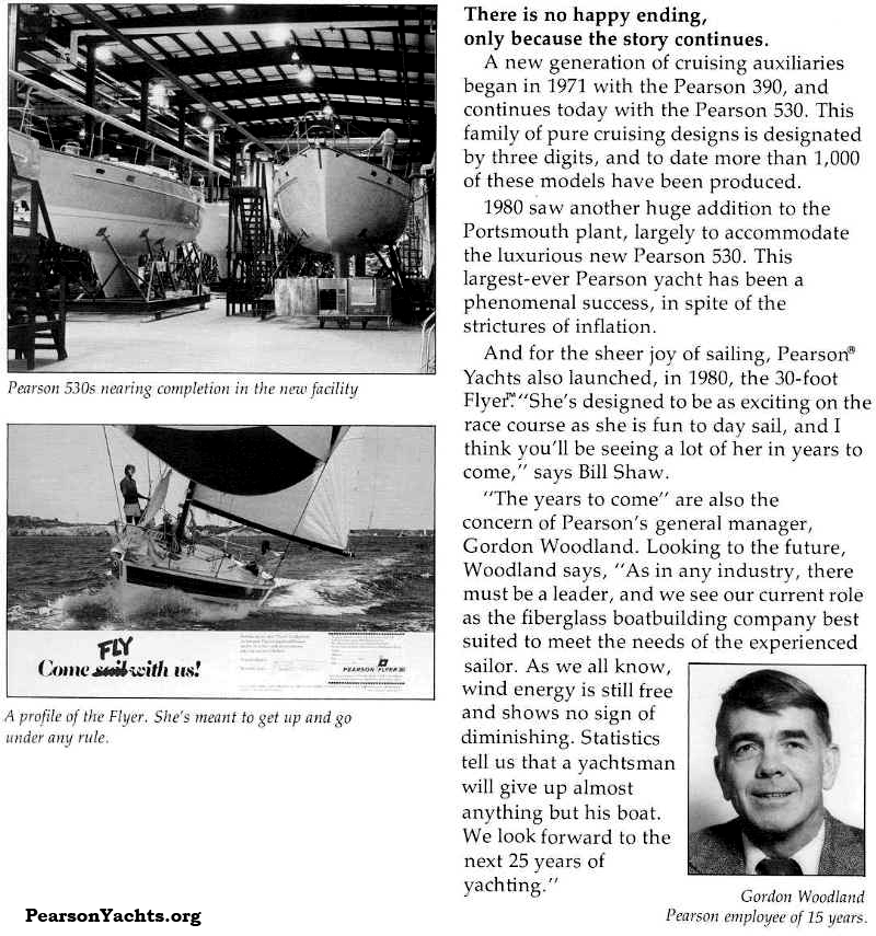 The years to come are also the concern of Pearson's general manager, Gordon Woodland. Looking to the future, Woodland says, As in any industry, there must be a leader, and we see our current role as the fiberglass boatbuilding company best suited to meet the needs of the experienced sailor. As we all know, wind energy is still free and shows no sign of diminishing. Statistics tell us that a yachtsman will give up almost anything but his boat. We look forward to the next 25 years of yachting.