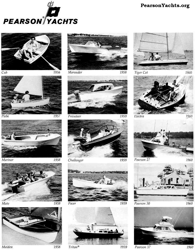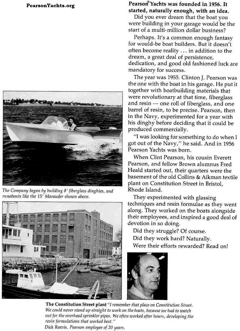 The year was 1955. Clinton J. Pearson was the one with the boat in his garage. He put it together with boatbuilding materials that were revolutionary at that time, fiberglass and resin - one roll of fiberglass, and one barrel of resin, to be precise. Pearson, then in the Navy, experimented for a year with his dinghy before deciding that it could be produced commercially. I was looking for something to do when I got out of the Navy, he said. And in 1956 Pearson Yachts was born.