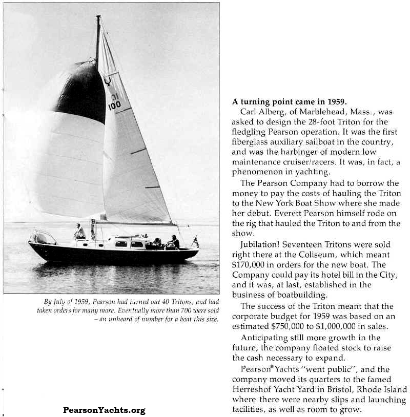 The success of the Triton meant that the corporate budget for 1959 was based on an estimated $750,000 to $1,000,000 in sales. Anticipating still more growth in the future, the company floated stock to raise the cash necessary to expand. Pearson Yachts went public, and the company moved its quarters to the famed Herreshof Yacht Yard in Bristol, Rhode Island where there were nearby slips and launching facilities, as well as room to grow.