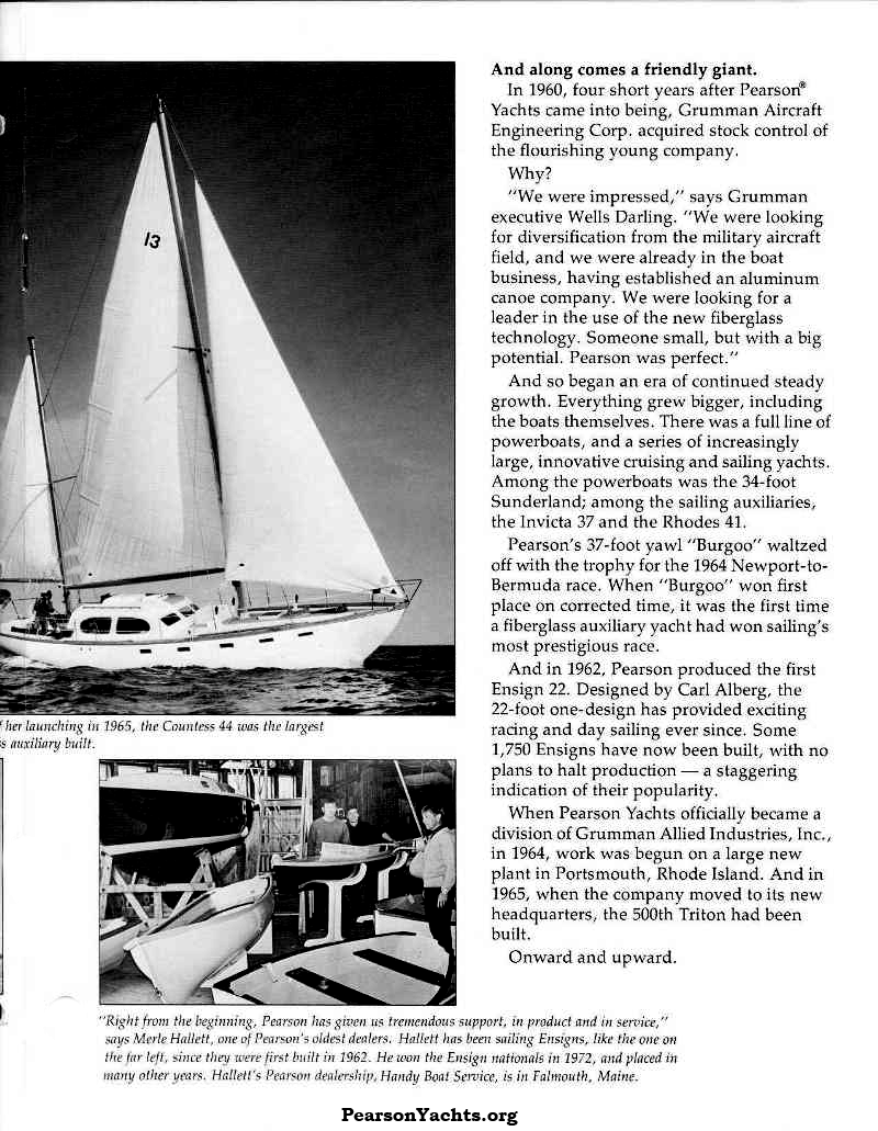 In 1960, four short years after Pearson Yachts came into being, Grumman Aircraft Engineering Corp. aquired stock control of the flourishing young company.