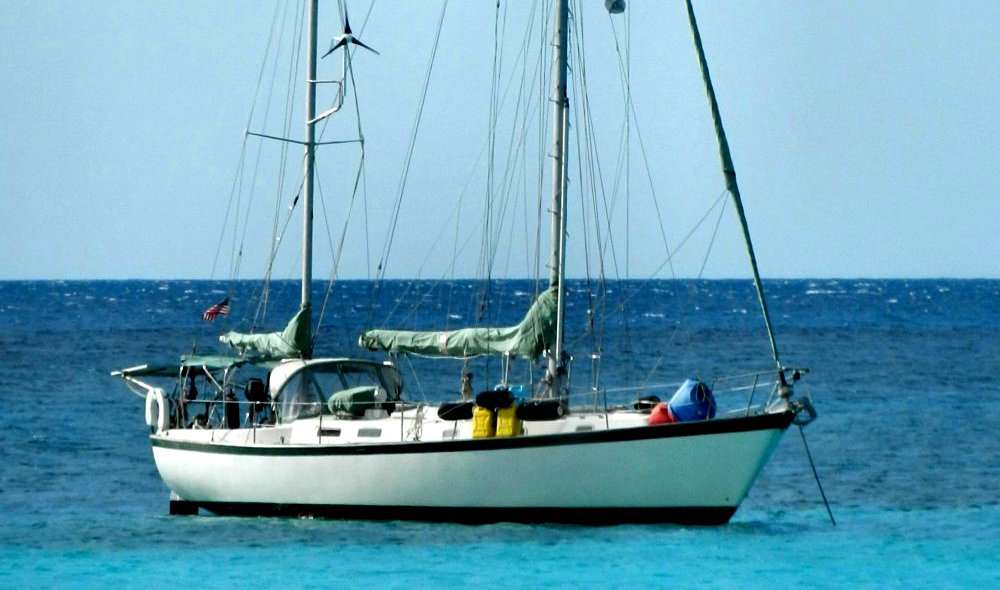 Now it’s time to go to sea and adjust the shrouds so that the mast will remain straight on both tacks under moderate conditions (8-12 kn. of wind). As you sight up the aft side of the mast, it should appear straight on either tack. If it falls off to leeward at the top of the mast, tighten the windward upper shroud. If the top hooks to windward then slack the windward upper shroud. You may have to do this several times. Remember not to add more tension. If you tighten one shroud, then slack the other. Too much tension will cause the mast to bend. Once you have a straight mast near the top, you may find it necessary to adjust the lower shrouds in a similar manner. When at rest the aft lowers should be quite slack and the forward lowers should be firm (but not overly so).