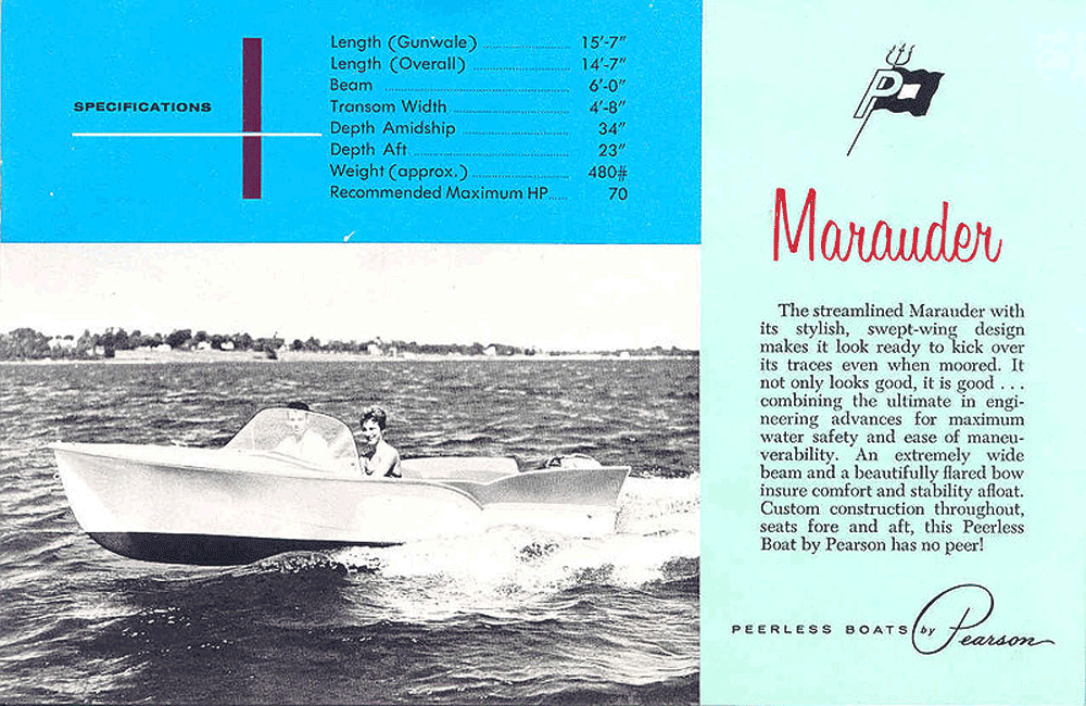 The streamlined Marauder with its stylish, swept-wing design makes it look ready to kick over its traces even when moored. It not only looks good, it is good... combining the ultimate in engineering advances for maximum water safety and ease of maneuverability. An extremely wide beam and a beautifully flared bow insure comfort and stability afloat. Custom construction throughout, seats fore and aft, this Peerless Boat by Pearson has no peer!